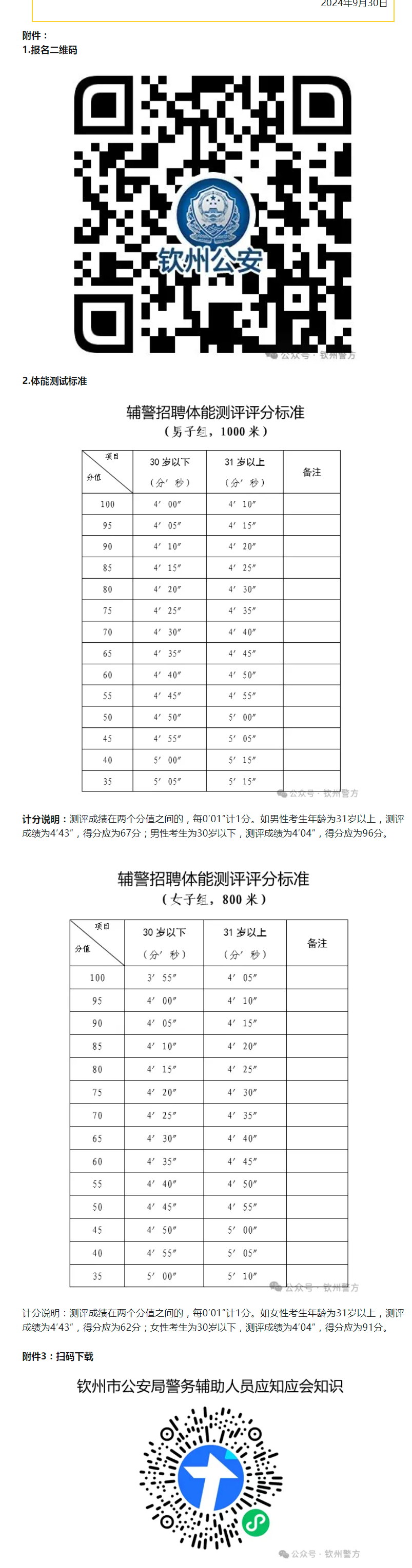 1.體能測(cè)試。所有資格審查合格的考生必須參加體能測(cè)試。體能測(cè)試項(xiàng)目為長跑(男子1000米,女子800米),體能測(cè)試計(jì)算成績,評(píng)分標(biāo)準(zhǔn)附后。