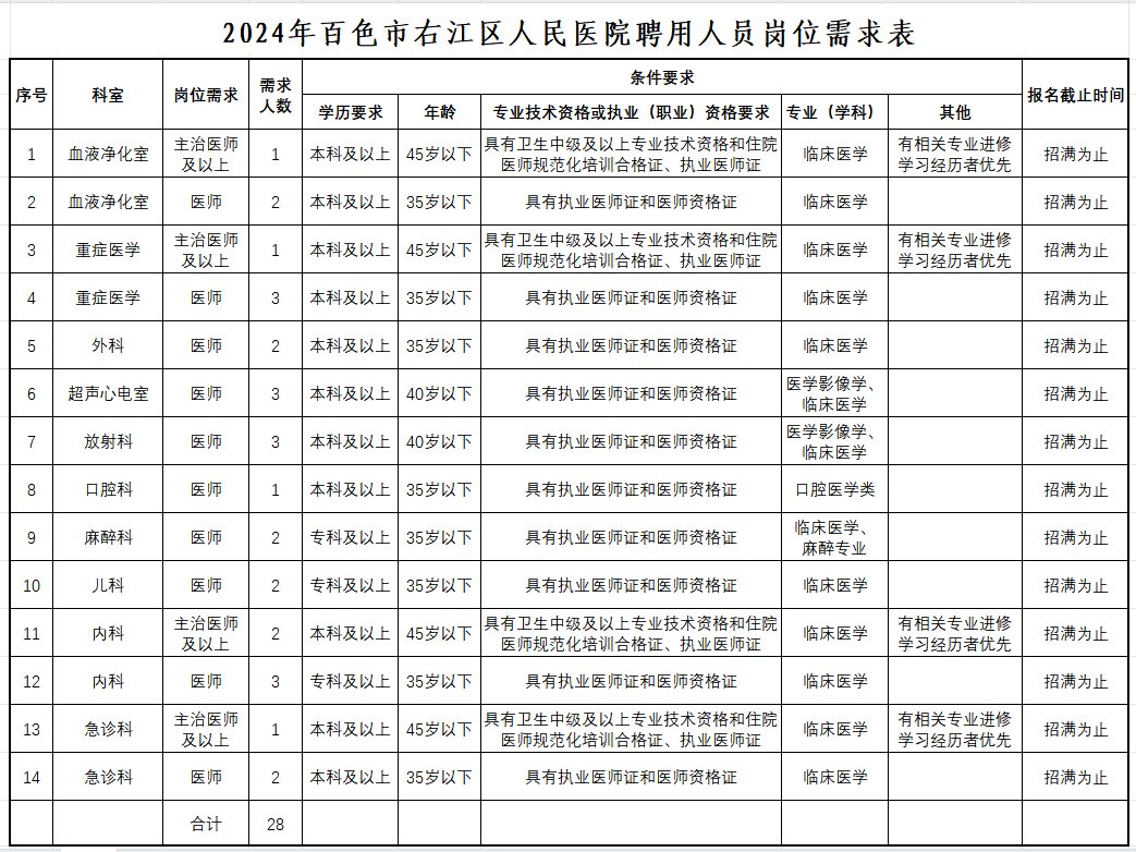 百色市右江區(qū)人民醫(yī)院2024年公開招聘工作人員28人公告