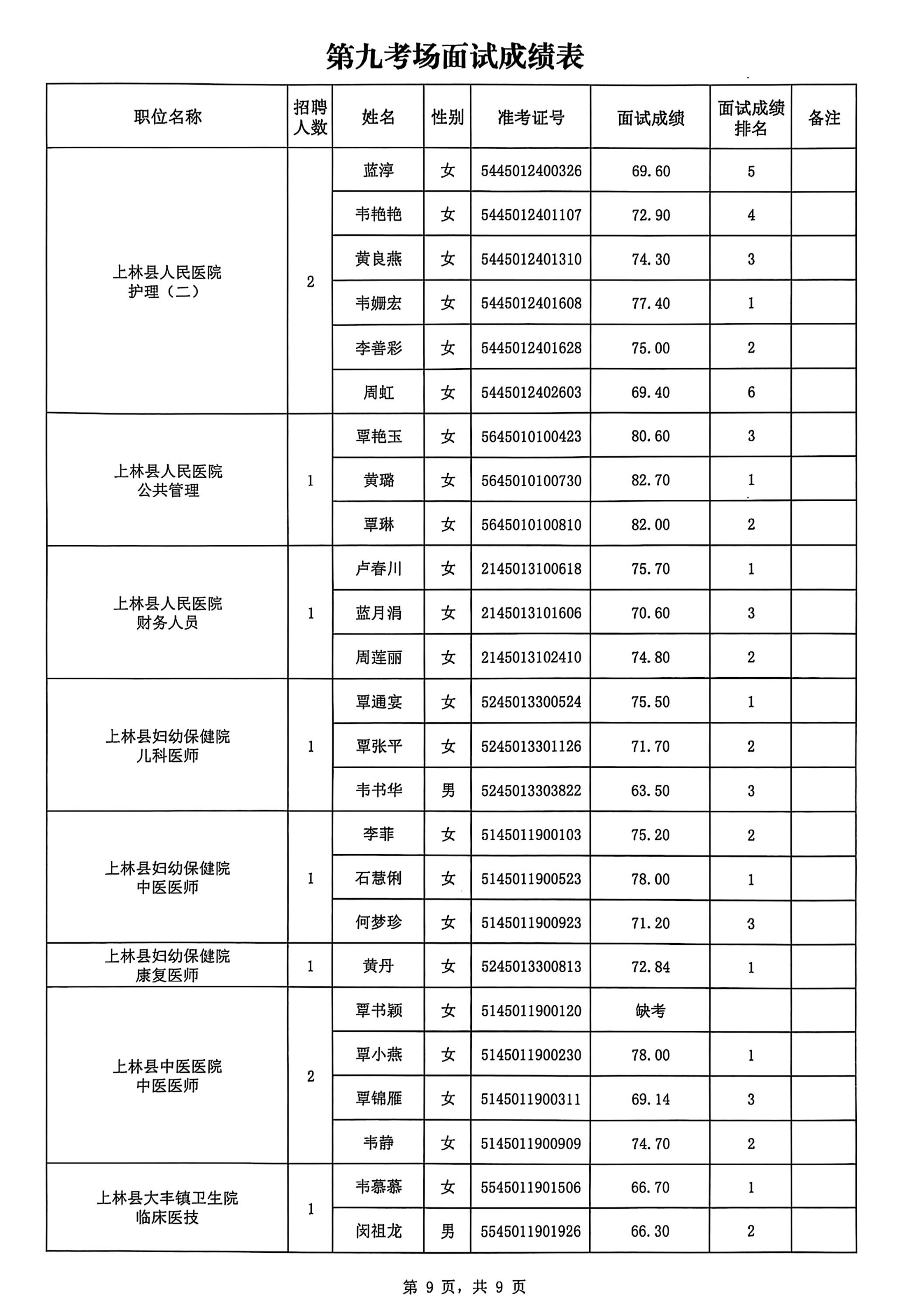 上林縣2025年公開(kāi)考試招聘事業(yè)單位工作人員面試成績(jī)公布如下: