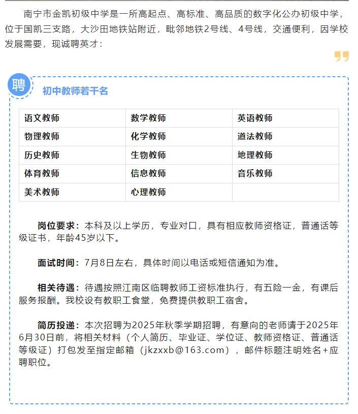 2025年南寧市金凱初級中學招聘若干名