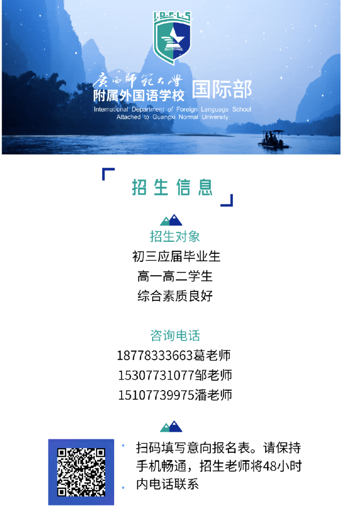 廣西師范大學(xué)附屬外國(guó)語學(xué)校位于以山水之美聞名世界的桂林市,教育教學(xué)成績(jī)斐然。其國(guó)際部是廣西壯族自治區(qū)最早批準(zhǔn)成立的國(guó)際部,自2011年成立以來,積極引進(jìn)國(guó)外先進(jìn)教育理念,整合師大附外的優(yōu)質(zhì)基礎(chǔ)教育資源,堅(jiān)持社會(huì)主義核心價(jià)值觀為導(dǎo)向,培養(yǎng)具有崇高理想、愛國(guó)信念和突出跨文化交際能力的社會(huì)主義新型人才。