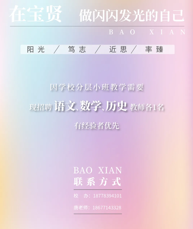 4.取得初級中學以上教師資格證,具有良好的身體和心理素質,體檢符合教師資格認定標準,對教育有理想追求,理解并愿意踐行桂林市疊彩區(qū)寶賢學校辦學理念。
