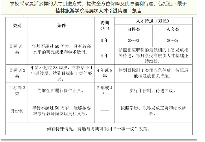 4.根據(jù)自治區(qū)政府文件要求,符合相應(yīng)條件者,學(xué)校積極配合申請廣西壯族自治區(qū)高層次人才認(rèn)定和各類人才項(xiàng)目,若入選可享受各類優(yōu)厚的人才待遇,詳情請登錄廣西高層次人才“一站式”服務(wù)平臺(http://www.gxrc.org/)查閱。首次來桂工作的35歲以下、具有博士學(xué)位的青年人才,可按照政策申領(lǐng)自治區(qū)青苗人才普惠性支持。如入選桂林市高層次人才,還可以享受桂林市高層次人才有關(guān)津貼、購房補(bǔ)貼和個(gè)稅獎勵(lì)等人才補(bǔ)助。詳見桂林市高層次人才一站式服務(wù)平臺(https://gcc.glrcw.com/)。