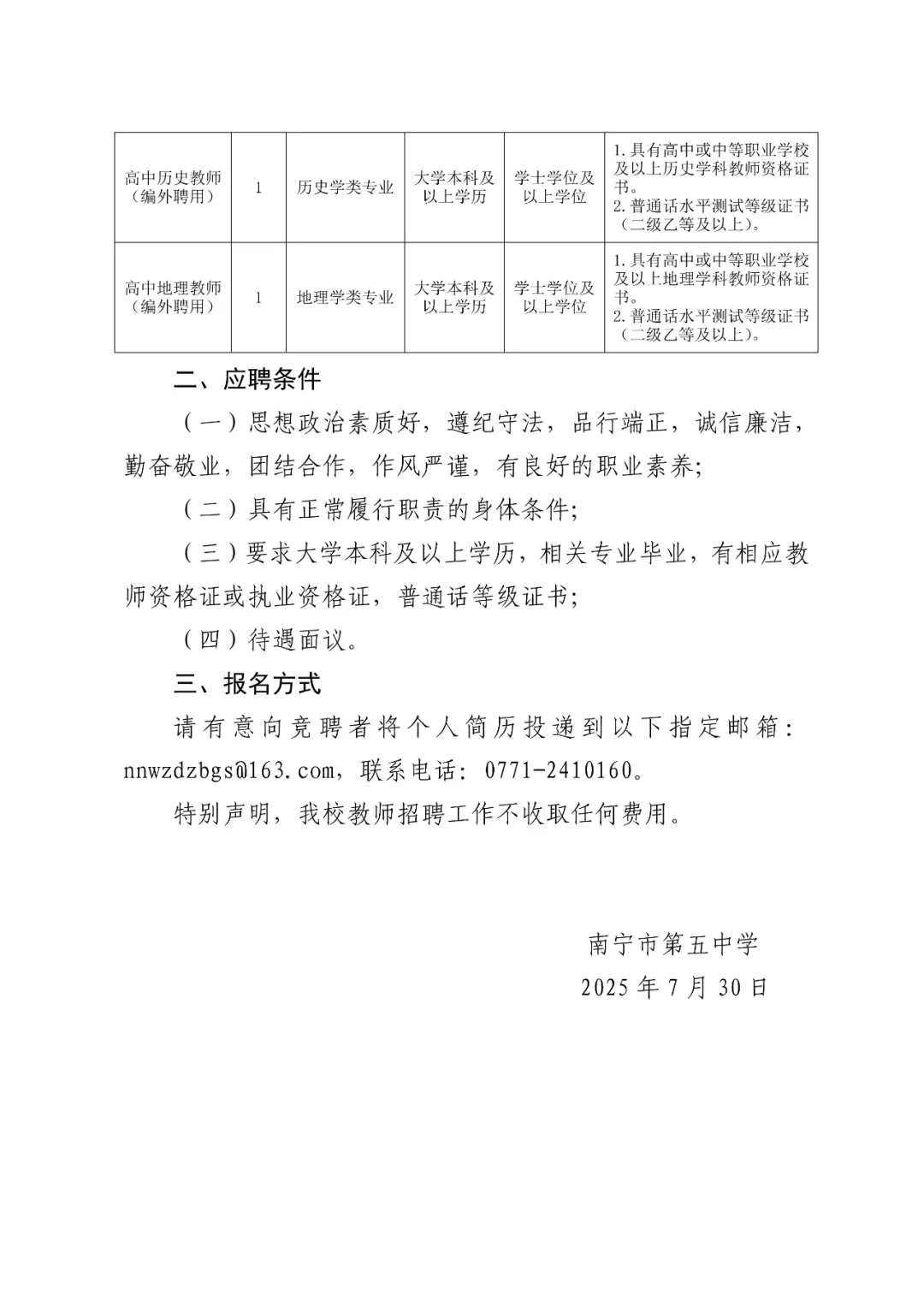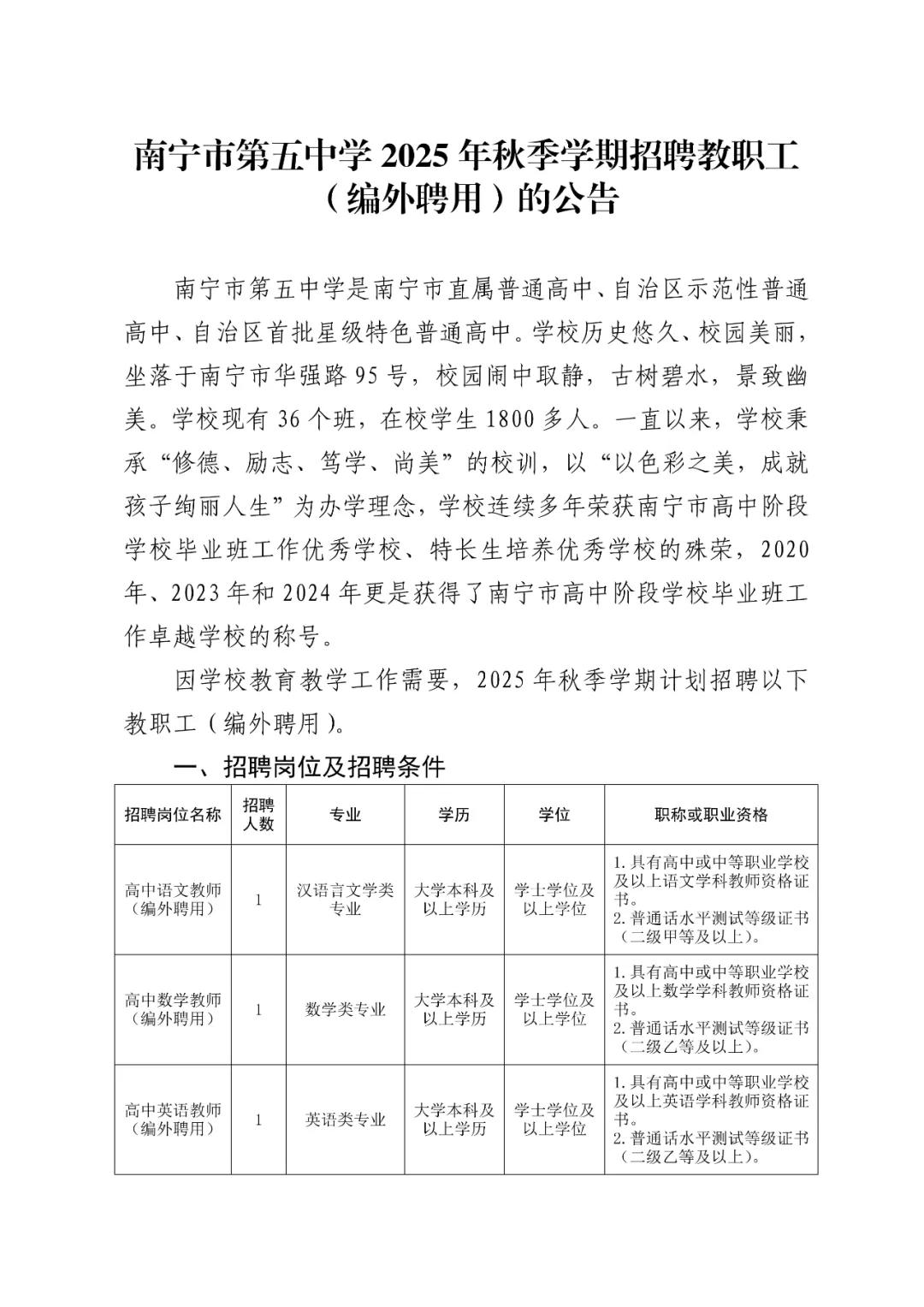 南寧市第五中學2025年秋季學期招聘教職工(編外聘用)5人