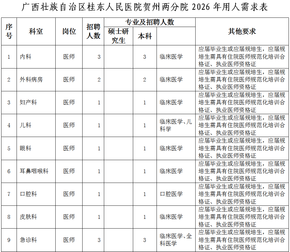 (應(yīng)聘報(bào)名二維碼)同時(shí),按以下要求提供個(gè)人應(yīng)聘材料(電子版)發(fā)電子郵箱:gdyy2817726@163.com(郵件主題請(qǐng)標(biāo)明:“姓名+賀州兩分院”字樣)。應(yīng)屆畢業(yè)生:個(gè)人簡(jiǎn)歷、身份證、就業(yè)推薦表、成績(jī)單、各種獎(jiǎng)項(xiàng)獎(jiǎng)勵(lì)證書、外語等級(jí)證書等。非應(yīng)屆畢業(yè)生:個(gè)人簡(jiǎn)歷、身份證、畢業(yè)證、畢業(yè)證備案登記表、學(xué)位證、學(xué)位證備案登記表、職稱證、執(zhí)業(yè)證、住院醫(yī)師規(guī)范化培訓(xùn)合格證、工作證明等。報(bào)名時(shí)所提交的申請(qǐng)材料必須真實(shí)、準(zhǔn)確,因報(bào)名時(shí)提交的申請(qǐng)材料不真實(shí)、不完整或錯(cuò)誤填寫報(bào)名信息,造成資格審查、面試資格審查不通過的,后果由報(bào)名人員自行承擔(dān)。(2)資格審核。人事科依據(jù)招聘公告和用人需求規(guī)定的資格條件對(duì)應(yīng)聘人員簡(jiǎn)歷進(jìn)行收集和資格初步審查,經(jīng)招聘工作領(lǐng)導(dǎo)小組審核后,確定符合崗位條件報(bào)名人員名單,由醫(yī)院人事科電話或短信通知符合條件人員。(3)考核??己斯P試和面試由人事科負(fù)責(zé)組織實(shí)施,協(xié)助部門為醫(yī)務(wù)部、護(hù)理部、科教科以及用人科室,紀(jì)律監(jiān)督部門為監(jiān)察室。逾期未參加則視為自愿放棄。(4)試工。通過考核的非應(yīng)屆畢業(yè)應(yīng)聘人員,須到醫(yī)院試工5天。試工不通過,不予聘用。(5)體檢。體檢工作由廣西壯族自治區(qū)桂東人民醫(yī)院按照有關(guān)規(guī)定統(tǒng)一組織。體檢標(biāo)準(zhǔn)參照《廣西壯族自治區(qū)事業(yè)單位公開招聘人員體檢通用標(biāo)準(zhǔn)(試行)》《廣西壯族自治區(qū)事業(yè)單位公開招聘人員體檢操作手冊(cè)(試行)》執(zhí)行。體檢不合格或隱瞞真實(shí)情況致使體檢結(jié)果失真的,不予聘用。因體檢不合格空缺崗位的,將按考核的綜合成績(jī),從高到低,順位補(bǔ)充體檢人員。(6)公示和聘用。對(duì)擬聘非應(yīng)屆畢業(yè)應(yīng)聘者在全院范圍內(nèi)進(jìn)行公示,公示期為5個(gè)工作日,公示期滿無異議按程序辦理聘用手續(xù)。對(duì)公示有異議,經(jīng)核實(shí)影響聘用的,取消其聘用資格;對(duì)反映問題難以核實(shí)的暫緩聘用,待核實(shí)清楚后按有關(guān)規(guī)定辦理。