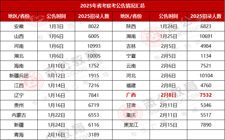 由廣西壯族自治區(qū)公務(wù)員局發(fā)布,核心查詢(xún)平臺(tái)為八桂先鋒網(wǎng)、廣西人事考試網(wǎng),也可在各市黨建網(wǎng)、人事考試相關(guān)平臺(tái)查看。2025年公告發(fā)布時(shí)間為2月8日。