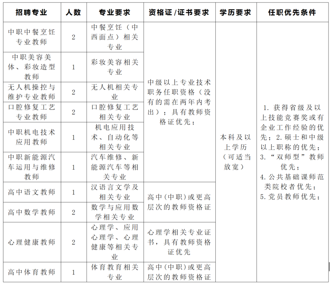 機(jī)電應(yīng)用技術(shù)、中餐烹飪、新能源汽車檢測(cè)與維修、平面設(shè)計(jì)、社會(huì)文化藝術(shù)、美發(fā)與形象設(shè)計(jì)專業(yè),各1人。