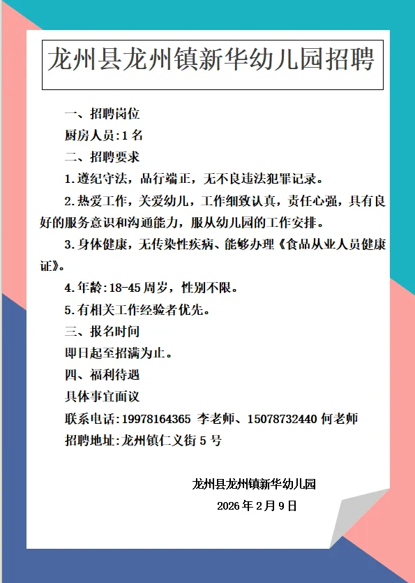 原文標題:龍州縣龍州鎮(zhèn)新華幼兒園招聘
